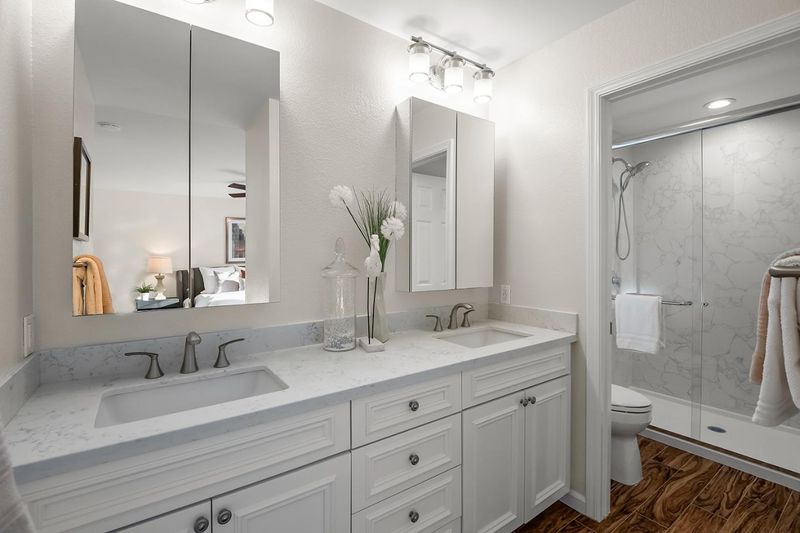 - Double Sinks, Half on Ground Floor, Primary - Stall Shower(s), Shower over Tub - 1, Tile