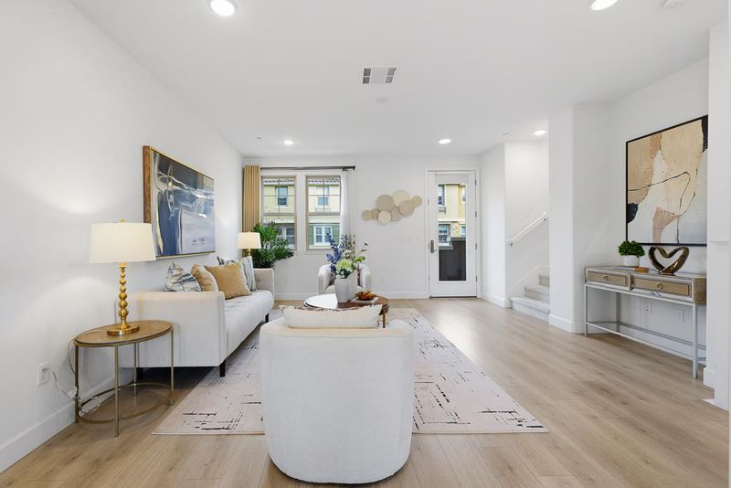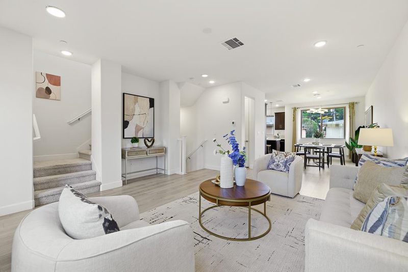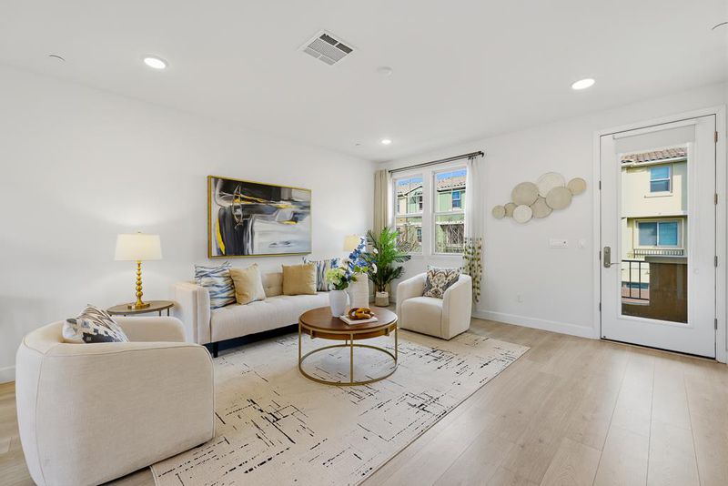 Bright and spacious 4bd/3.5ba townhome with high 9-ft ceilings and large windows filling the home with natural light all day. A unique feature its location next to the park, with generous distance from neighbor homes. The ground level features a private en-suite bedroom perfect for guests, in-laws, or a home office along with a side-by-side two-car garage. On the main level, enjoy an airy open-concept living area with higher ceilings, wood floors, and a gourmet kitchen equipped with a center island, quartz countertops, and stainless steel appliances. A powder room and sunlit balcony further enhance comfort and convenience. Large windows invite abundant natural light and offer a pleasant green belt view, creating a serene and inviting atmosphere. Upstairs offers a bright primary suite with walk-in closet, two additional bedrooms, and a laundry area. Owned by the original owners, the home is fresh like new with engineered wood floors, dual zone HVAC, and an attached 2-car garage. Minutes from Google, Microsoft, NASA, and other major Silicon Valley campuses. With quick access to Highways 101, 85, and 237, Caltrain, and Light Rail, plus convenient access to Stevens Creek Trail, this home offers the ideal blend of comfort, convenience, and Silicon Valley living. Must See!!!