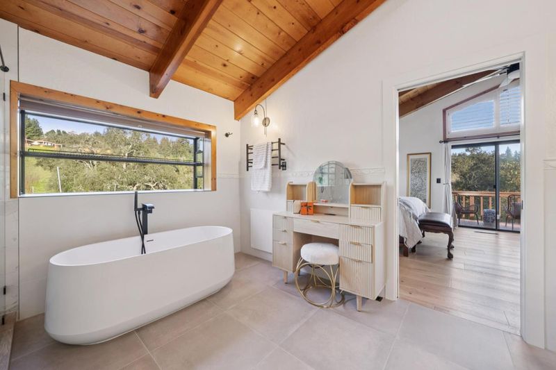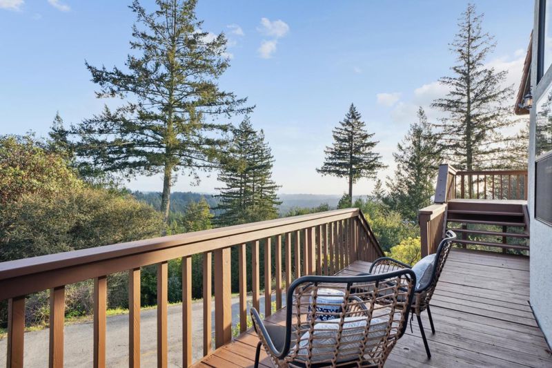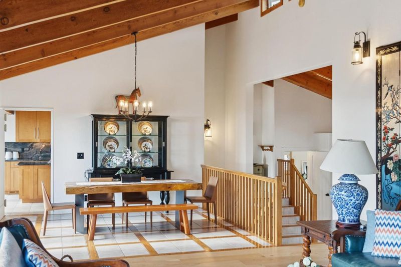 "Ridge Top" estate on 13 acres with breathtaking ocean, mountain & vineyard views! Tri-level Mediterranean-style home built in 1992. Spacious formal entry with vaulted ceilings. Steps up to living/dining room w/fireplace, vaulted wood ceilings, sliders to deck. Remodeled kitchen with cherry cabinets, granite countertops, stainless appliances. Pool view from kitchen window. Bright breakfast bay with floor-to-ceiling windows, spectacular 180 views. New hardwood flooring, bathrooms remodeled in '24. Two large primary suites, new custom plantation shutters. Primary bathroom features a luxurious deep, free-standing soaking tub under window, oversized shower, dual vanity. Steps down to guest suite with huge walk-in closet. Lower level family/rec room with wet bar, sitting area, spacious office bay. 3rd bedroom with fireplace, sliders to deck, adjacent hall bath. Lwr level layout designed for potential 4th bedroom. Lap pool w/spa, sunny travertine deck. Usable land offers space for vineyard, gardening, sport court or horses. Long circular driveway, generous parking, room for oversized vehicle/ RV. 4 car drive-thru garage, vaulted wood ceilings, potential to convert to ADU? Comcast internet, excellent shared well. Central location near Summit store & schools, easy drive to town or beach!