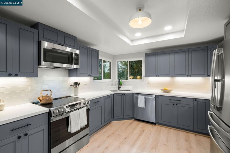 This beautifully renovated 4-bd,3-ba,1,972 sq ft home in the prestigious Twin Creek Hills enclave of San Ramon is thoughtfully updated&designed w/modern sophistication&comfort.This exceptional residence features a fully renovated chef’s kitchen,updated bathrooms,wide plank luxury flooring,dual pane windows,designer paint colors,new cabinetry&appliances,updated lighting,new HVAC&dual living spaces.The chef’s kitchen is the heart of the home,showcasing premium appliances, generous storage&contemporary designer finishes.The great room encompasses the living,dining &kitchen spaces highlighted by soaring vaulted ceilings&natural light.The inviting family room offers a wood-burning fireplace&built-in desk area.A main-level bedroom& full bath provide ideal flexibility for guests or private office.The primary suite is a true oasis w/ spa-inspired en suite featuring custom shower, soaking tub, dual-sink marble vanity&three closets.The backyard retreat includes manicured landscaping,citrus trees,spacious deck w/trellis—perfect for entertaining.Residents enjoy access to community pool,tennis&basketball,award-winning schools&close proximity to San Ramon City Center,parks hiking&commuter routes.A rare opportunity to acquire a fully renovated home in one of SR's most desirable neighborhoods!