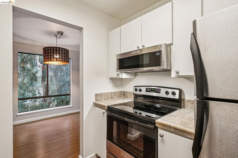 - Dishwasher, Electric Range, Microwave, Refrigerator, Tile Counters, Electric Range/Cooktop
