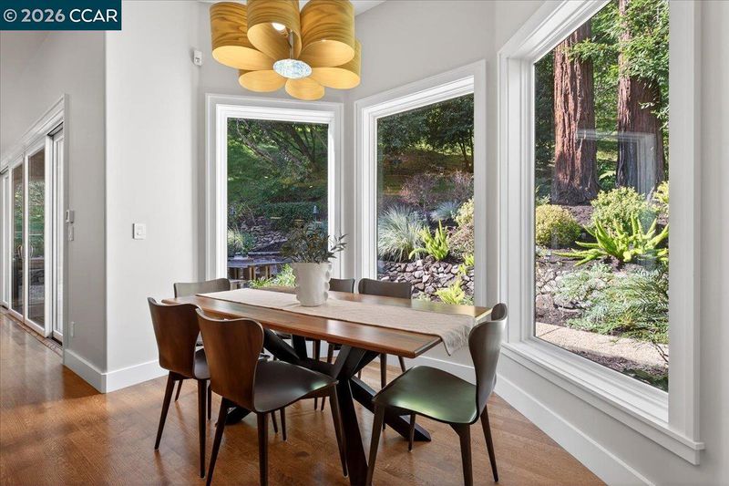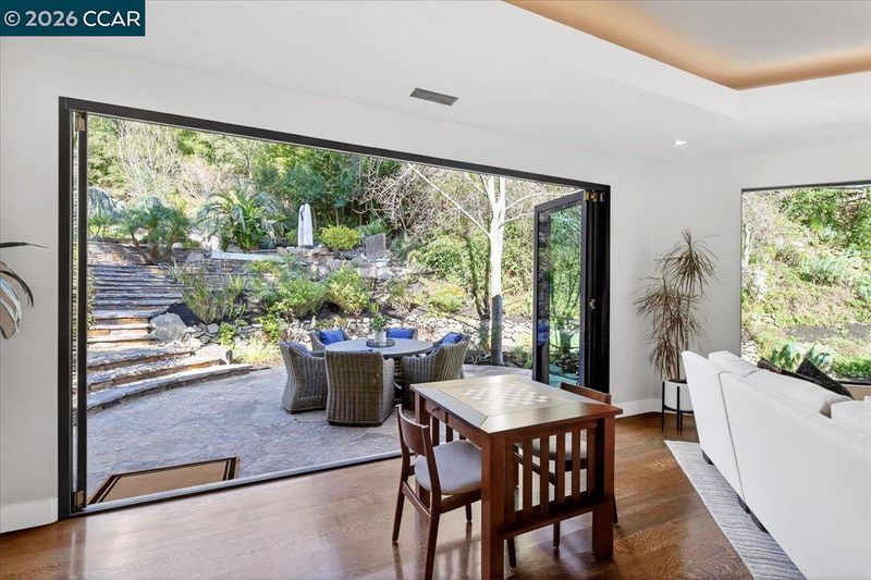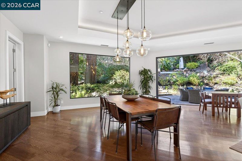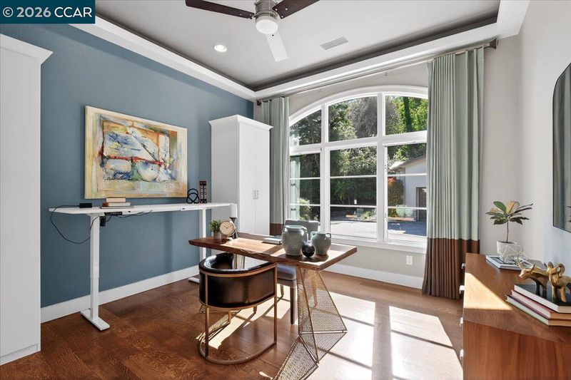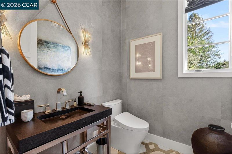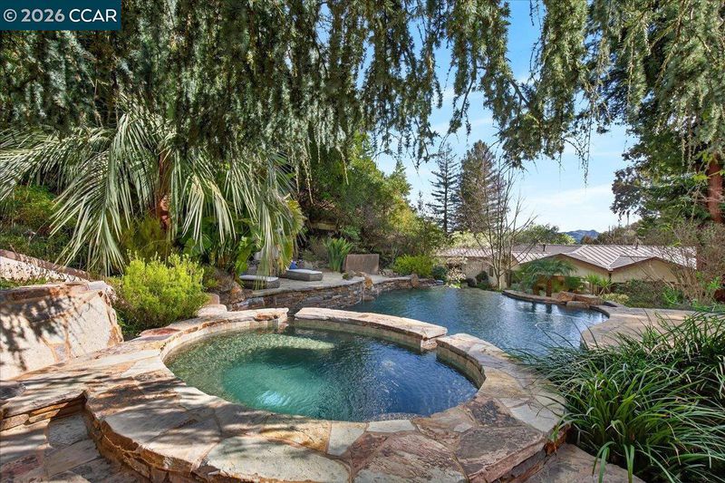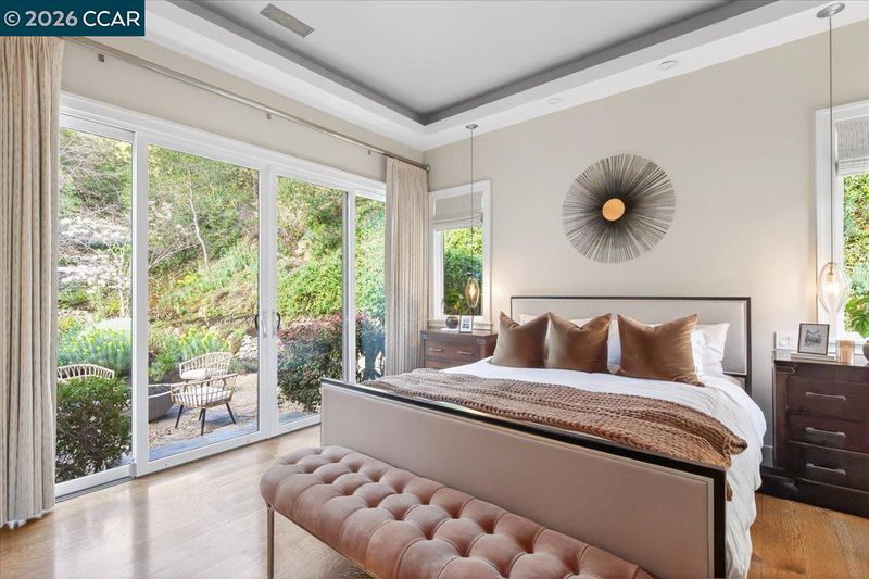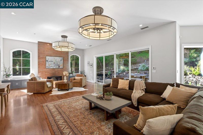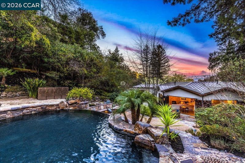 A striking contemporary estate celebrating California’s indoor-outdoor lifestyle, marked by architectural presence and modern elegance. Soaring ceilings, hardwood floors, designer lighting, and expansive glass elevate its sophisticated design. The formal living room features a gas fireplace, tray ceiling with cove lighting, hurricane sliding doors, dining area, and wine closet for approx. 200 bottles. The gourmet kitchen offers Thermador appliances including six-burner range, double ovens, dual Bosch dishwashers, prep sink, expansive island, soft-close cabinetry, under-cabinet lighting, and bay-window nook with garden views. The family room includes a gas fireplace, custom built-ins, and patio access. Bedrooms include a Jack and Jill suite, versatile bedroom with built-ins, and private wing with guest suite. The primary suite offers its own fireplace, patio access, walk-in closets with custom organizers, and spa-style bath with double vanity, freestanding soaking tub, dual shower heads, and bidet features. Resort-style grounds showcase an infinity-edge Pebble Tec pool and spa with cascading water and slide, patios, paver walkways, outdoor kitchen, fireplace, sport court, greenhouse, and mature redwoods. Ideally located just minutes to town, commute routes, and top-rated schools.
