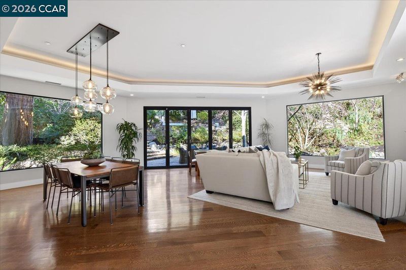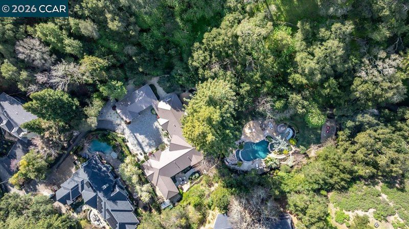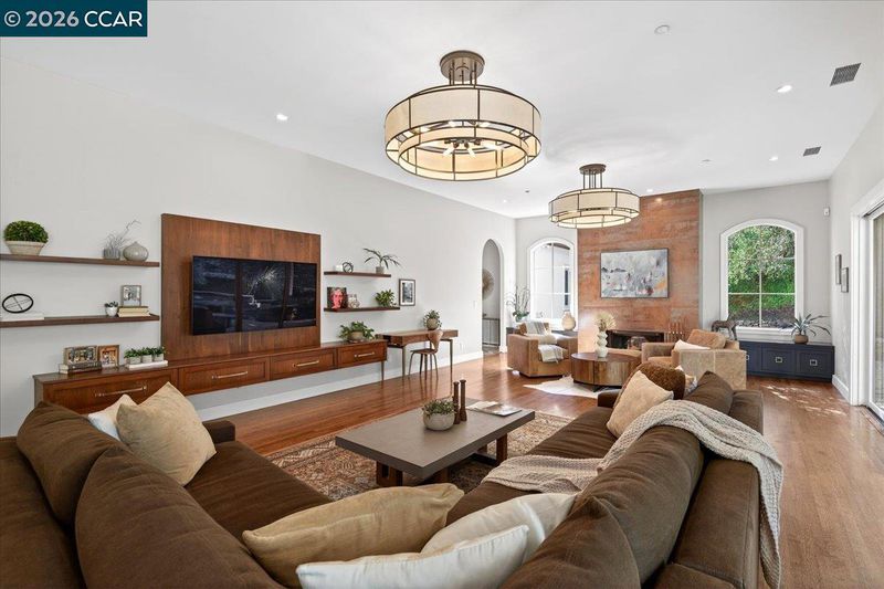 Striking contemporary estate celebrating California’s indoor-outdoor lifestyle, marked by architectural presence and modern elegance. Soaring ceilings, hardwood floors, tray ceiling with cove lighting and expansive glass. Living room features a gas fireplace, hurricane sliding doors, dining area, & wine closet. Gourmet kitchen- Thermador appliances, six-burner range, double ovens, dual Bosch dishwashers, prep sink, expansive island, soft-close cabinetry, under-cabinet lighting, and bay-window nook with garden views. Family room includes a gas fireplace, custom built-ins, and patio access. Bedrooms include a Jack and Jill suite and private wing with guest suite. Primary suite- gas fireplace, patio access, walk-in closets, spa-style bath w/ double vanity, freestanding soaking tub, dual shower heads, & bidet features. Resort-style grounds showcase an infinity-edge Pebble Tec pool and spa with cascading water and slide, patios, paver walkways, outdoor kitchen, fireplace, sport court, greenhouse & mature redwoods