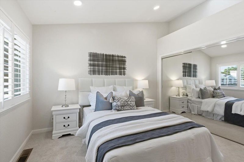 Tastefully remodeled 2 bed, 2.5 bath townhome located in the highly desirable Cabernet Vineyards Townhome community. A sunny & private courtyard entry welcomes you into a thoughtfully designed open floor plan. The inviting living room features a tiled fireplace, built-in shelving, engineered wood floors, recessed lighting, & expansive windows overlooking the lush common grounds. The well appointed chefs kitchen offers a breakfast bar, abundant Shaker style cabinetry, quartz countertops, and stainless steel appliances, perfect for both everyday living & entertaining. The impressive primary suite boasts vaulted ceilings, recessed lighting, a walk-in closet, and a custom walk-in stall shower with elegant vanity. The generously sized guest bedroom is an en-suite with high ceilings, ample closet space, plush carpeting, and a beautifully designed tiled tub bath. Additional highlights include a large attached 2 car garage with automatic opener & extra storage, central heating & air conditioning, new plush carpeting, recessed lighting throughout, & abundant natural light. Ideally located near shopping, schools, & convenient freeway access. Lovingly maintained by the original owner, this exceptional home is move-in ready and awaits its next custodians to create lasting memories.